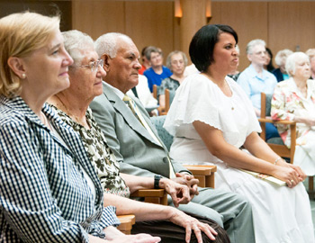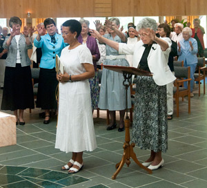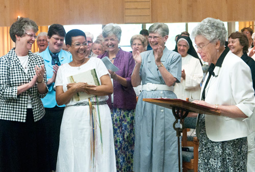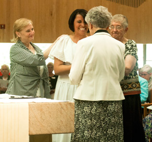 The assembly also rejoiced at the reception of Sister Joaquina into the novitiate. After being called forward and examined as to her own readiness to move forward in the formation process, Sister Joaquina received a copy of the Adrian Dominican Constitution and Statutes. Her formation during her novitiate years will be under the direction of Sister Maribeth Howell, OP, the incoming director of formation. Sister Joaquina earned a bachelor’s degree in clinical psychology from the University of the Third Millennium, Dominican Republic, in 2006 and a master’s in human sexuality and therapy with couples from Universidad de la Tercera Edad, Dominican Republic. She taught at the University of the Third Age, specialized in treating victims of domestic violence, and was involved in group therapy and the psychology of geriatric patients. When she entered the congregation in October 2010, Sister Joaquina had already been involved with the Adrian Dominican Sisters as an associate for several years. The celebration of the Feast of St. Dominic, which had begun with Morning Prayer in Holy Rosary Chapel, continued with a festive dinner, a reception for sisters, associates and co-workers, and evening prayer in St. Catherine Chapel. Story and photos submitted by the Adrian Dominicans. Photos by Melinda P. Ziegler. |