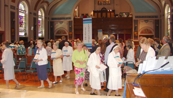 On Sunday, June 26, the Sisters of St. Dominic celebrated the transfer of leadership during a Eucharistic liturgy. The liturgy began with a procession of ministries, during which sisters, associates and lay people who work with the sisters carried in signs representing the many diverse places in which they serve. The gospel choir from St. Augustine Parish in the Bronx provided rousing music for the Liturgy. Following the homily, the sisters who served in leadership from 2005 to 2011 (Sisters Mary Malone, president; Catherine Howard, Patricia Howell and Dorothy Maxwell, councilors) were recognized for their service. They presented framed copies of the chapter directives to the new leadership team.