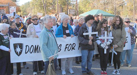 SOA Watch 2012 By Ceil Roeger, OP (Houston) The weekend of Nov. 16–19, Dominicans, along with family members, students and friends from across the United States, joined other peace activists at the annual SOA Watch vigil held in front of the gates at Ft. Benning, Georgia. This vigil, which began in 1990, calls for the closing of the Western Hemisphere Institute for Security Cooperation, formerly known as the School of the Americas. Some participants arrived Thursday in order to join the Friday morning rally held at the Stewart Detention Center in Lumpkin, Georgia. Approximately 450 people gathered to protest the detention of undocumented and their treatment. For many, the weekend began with the SOA Watch plenary session, where attendees were informed of the activities that have taken place during the past year. It was a time to celebrate the successes as Ecuador and Nicaragua were added to the list of countries that have agreed to stop sending troops and/or police to be trained at Ft. Benning. There was also a brief report on the meeting that was held earlier in the week at the White House. Denis McDonough, Deputy National Security Adviser to President Obama, met with a delegation from the SOA Watch movement in Washington DC on Nov. 13. You can read the report on this visit by visiting the SOA Watch web site. The Rally at the Gate began at 11:30 a.m. Prisoners of conscience as well as survivors of torture and violence in their home countries gave witness to expose the horrors of the SOA and to express solidarity with our sisters and brothers in Latin America. Interspersed among the stories was music from a variety of musicians. The rally closed with words of encouragement from Fr. Roy Bourgeois. For a number of years, the Dominican Sisters of Sinsinawa, Wisconsin, prepare and host a prayer service on Sunday morning of the vigil. “Ancestral Prayer Opening to the Future” was prepared and led Liz Sully, OP. With her drum she called forth our ancestors to be and walk with us. The words of the prayer asked us to move beyond our complicity in the violence around us and to claim a vision of changing the School for the Americas from one of violence to one whose “mission is wholeness of life and the creation of a healthy planet.” Following a scripture reading we sat in contemplative silence, before receiving crosses we would carry in the solemn procession and place on the fence at Ft. Benning later that morning. As the names on the crosses were read, we responded with “Presente.” On Saturday, sisters were encouraged to stop by the NETWORK table and pick up “Nuns on the Bus” stickers to wear on Sunday morning. We were instructed to gather near the stage around 9:45 Sunday. Sister Marge Clarke from NETWORK was scheduled to address the gathering prior to the “No Mas, No More” litany. The nuns joined her either on stage or in front of the stage as she spoke. She said that the eight-state “Nuns on the Bus” tour has spread and now we stood as “Nuns at the Gate.” The purpose of “Nuns on the Bus” was to call attention to the terrible effect proposed budget cuts would have on the poor and the marginalized. To shouts of support, she proposed that the government cut funding for the School of the Americas and use that money on education and health care. It was nearing time for the solemn procession, and we gathered behind our Dominicans for Peace and Justice banner with our crosses. As the names were called we walked slowly and solemnly, raising our crosses and responding “Presente.” As each person approached the gates of Ft. Benning, she/he encountered a fence that is erected for the purpose of keeping us out. It is on this fence that we place our crosses. It is here that we continue to give witness and call for an end to the School of the Americas. The numbers coming to the rally have been smaller the last couple of years. The Jesuits no longer hold their “teach-in” in Georgia. It is still heartening to see the diversity in the people who do come. We are of different ages, different skin tones and cultural backgrounds. In that respect, the movement is not dying out; it is growing. As several of us discussed this, it was said we do not come together for numbers. It is to reconnect; it is to stand in solidarity; it is to celebrate the successes the movement has made over the years. After all, this is one of the longest ongoing shows of solidarity with the people of Latin America. Sister Ceil Roeger, OP, is promoter of Justice, Peace and Care of Creation for the Dominican Sisters of Houston. |