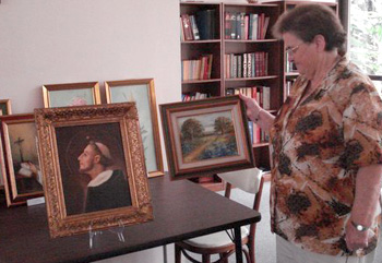 In the summer of 2013, the Archdiocese of Galveston Houston sold the mansion to the Galveston Historical Foundation. After the purchase of the building, the foundation planned a celebration which featured not only the 15 murals on display at the palace but also many of the other pieces Sister Mary Agnes painted during her life. After her retirement in 1968 until her death in 1980, she was able to focus on her art. Her paintings range from landscapes, Texas bluebonnets, and other flowers to those with religious themes, a bust of St. Dominic, the nativity and her famous painting depicting Mary giving the rosary to St. Dominic. In mid-summer, Sister Mary Agnes’ great nephew, Joe Synan, a board member of the Galveston Historical Foundation, contacted Sister Mary Magdalen Hanel, OP, archivist, for the Dominican Sisters of Houston requesting her assistance in gathering Sister Mary Agnes’ paintings. Many of her paintings can be seen in our houses, schools and administration building. In response to Joe’s request, Sister Mary Magdalen sent an invitation to the sisters inviting them to lend any painting(s) they might have to the exhibit. Joe had sent a similar invitation to members of Sister Mary Agnes’ family. As a result, 28 paintings were made available for display. The exhibit at Bishop’s Palace opened with a reception and lecture by Joe on Sept. 14 and closed Oct. 4. Because many of the sisters were unable to travel to Galveston, the exhibit was moved to St. Dominic Villa on Oct. 5. The paintings were on display there until Oct. 16. Story and photos courtesy of the Dominican Sisters of Houston |