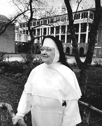 In 1895, as a young girl, Clara Malone was brought from Ohio to Galveston, Texas, to live with her orphaned cousin by her Uncle Nicholas Gallagher, who was better known to Galvestonians as Bishop Gallagher. Young Clara attended the Dominican Sisters’ Sacred Heart Academy as a boarder. In 1903, at age 17, she joined the Dominican Sisters and was given the name Sister Mary Agnes. She studied and taught art and music. As a young Dominican sister, Sister Mary Agnes painted murals in the main reception room of the Bishop’s Palace. The Bishop’s Palace was built between 1887 and 1893 for Walter Gresham and his family and was originally known as Gresham’s Castle. It was purchased by the Catholic Diocese of Galveston in 1923 and was the residence of Bishop Byrne. When the diocesan offices moved to Houston, the diocese opened the mansion to the public in 1963 and provided tours. The fees from the tours were used to support the Newman Center that operated in the basement.