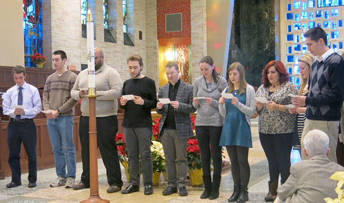 Dominican Young Adults By Sister Gina Fleming, OP (Amityville) On Sunday, Jan. 13, 13 students from Molloy College, along with four Dominican Volunteers from the East Coast, met at our motherhouse for a day of prayer. The day began with the young people attending the 10:45 a.m. liturgy at the motherhouse, and then joining the congregation for dinner in the dining room. Sister Margaret Galiardi, OP then led the group to Rosary Hall, where they began their afternoon of prayer. The afternoon was a wonderful mixture of silent reflection, sharing, and group prayer. As an onlooker, it seemed to be an experience that was enjoyed by all. A fitting conclusion to the day was their attendance at our evening vespers. At vespers, the members of the Dominican Young Adult group, with their parents, our sisters, associates, and other friends of the congregation in attendance, made their commitments to the DYA Molloy Chapter. Eleven new members made their first commitment, while two other members recommitted for another year. It was a tremendously hope-filled time for all in attendance as these young people committed themselves to an organization which imbues the four pillars of Dominican Life, prayer, study, community and mission. As each young person recited these words: