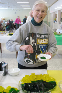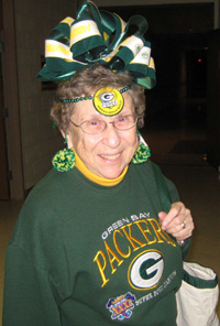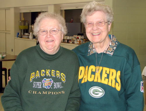 Racine Dominican Sisters (Racine, Wisconsin) show their support for their Super Bowl-winning team at a celebratory lunch Feb. 8. Top from left: Sisters Beverly Hebel and Juliana Dischler. Left: Sister Marian Diedrick. Right: Sister Mary Ann Weyker. |
